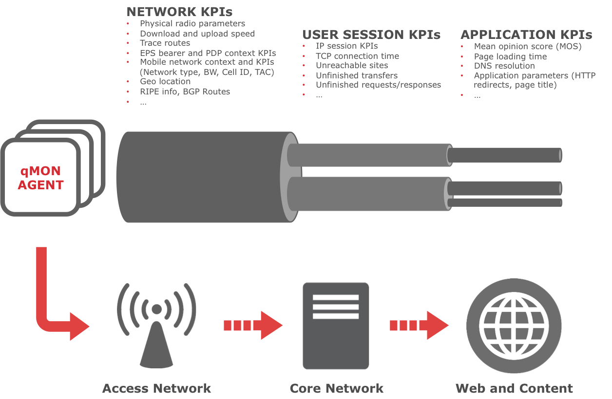 Naši qMON agenti merijo več kot 500 KPI, ki obsegajo vse od fizičnih radijskih parametrov in tradicionalnih omrežnih KPI do aplikacijskih kontekstov in MOS lestvic.